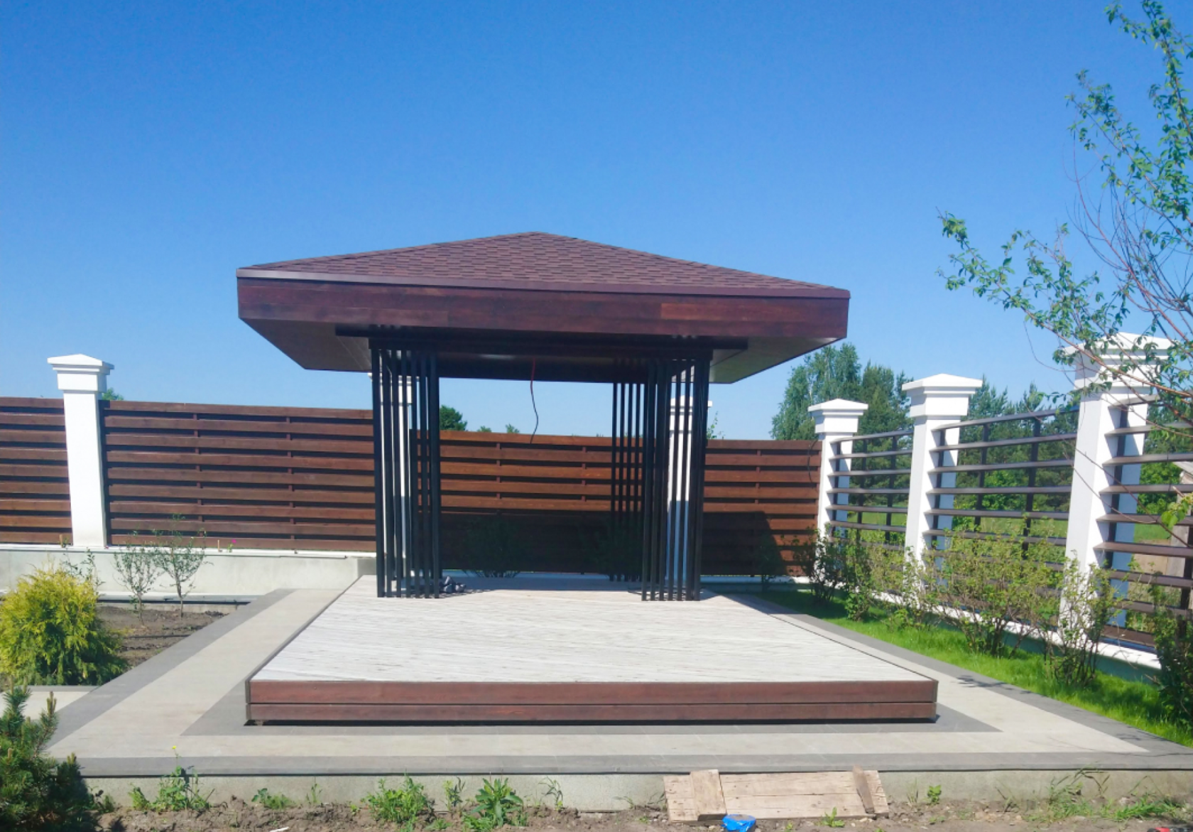 Открытая беседка выполнена из террасной доски, на скрытом крепеже. Мягкая кровля, металические стойки. Был залит монолитно-свайный фундамент.